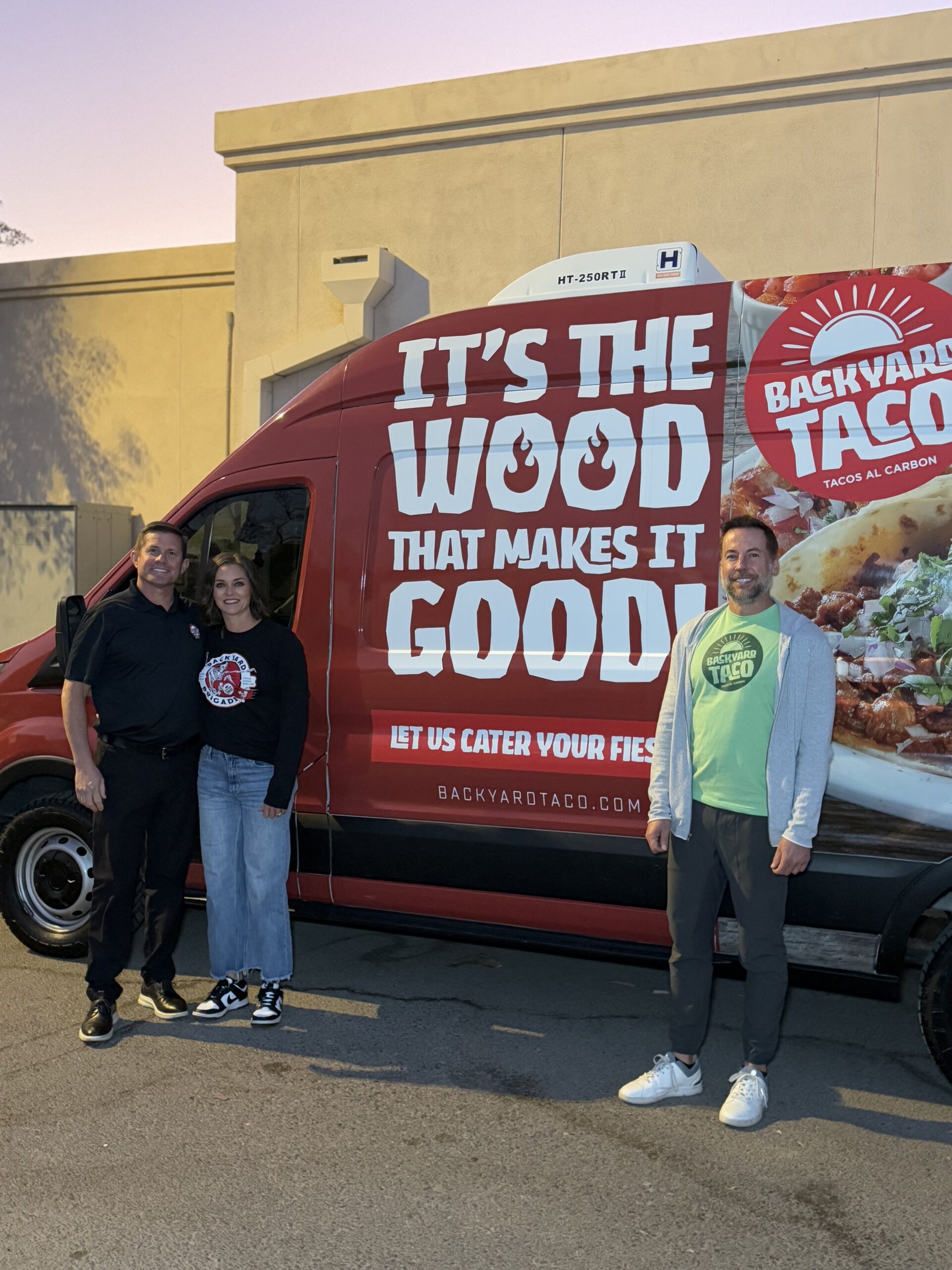 - Backyard Taco owners celebrating the donation of 10,000 meals to A New Leaf with our catering van.